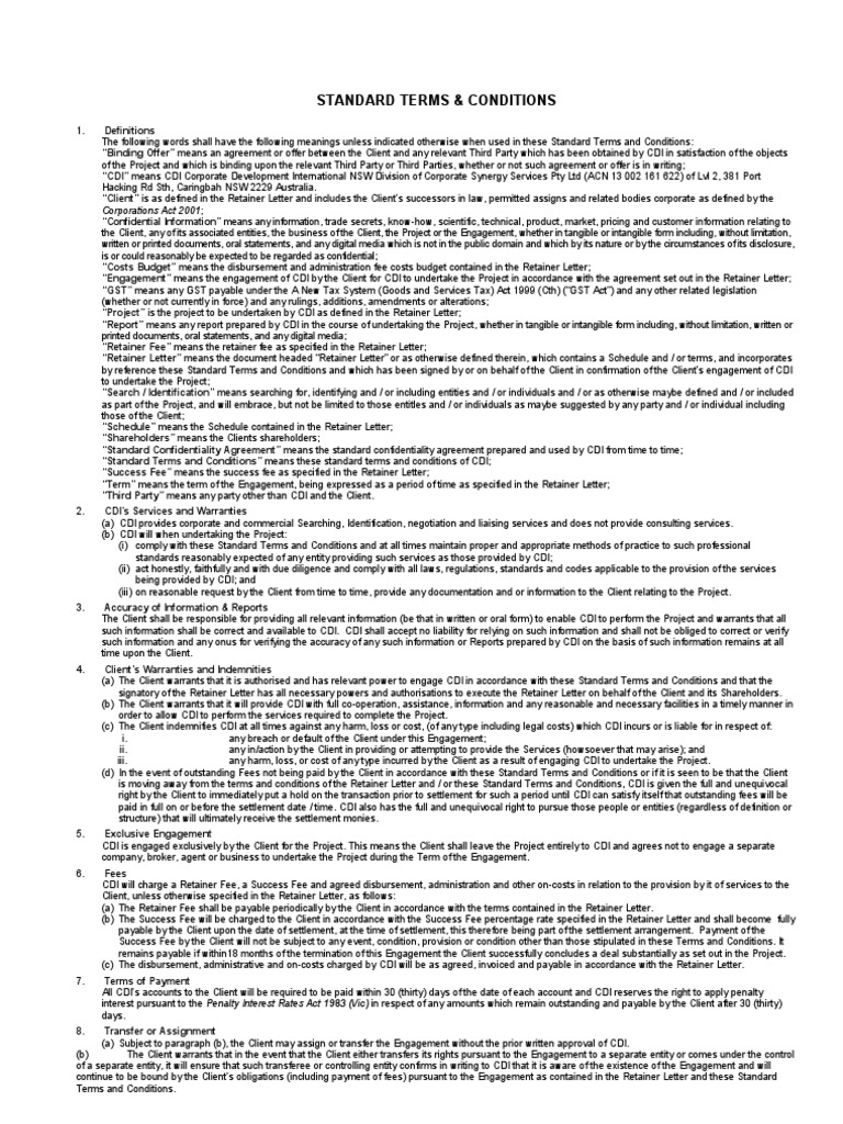 1. Definitions The following words shall have the following meanings unless indicated otherwise when used in these Standard Terms and Conditions: Binding Offer means an agreement or offer between the Client and any relevant Third Party which has been obtained by CDI in satisfaction of the objects of the Project and which is binding upon the relevant Third Party or Third Parties, whether or not such agreement or offer is in writing; CDI means CDI Corporate Development International NSW Division of Corporate Synergy Services Pty Ltd (ACN 13 002 161 622) of Lvl 2, 381 Port Hacking Rd Sth, Caringbah NSW 2229 Australia. Client is as defined in the Retainer Letter and includes the Clients successors in law, permitted assigns and related bodies corporate as defined by the Corporations Act 2001; Confidential Information means any information, trade secrets, know-how, scientific, technical, product, market, pricing and customer information relating to the Client, any of its associated entities, the business of the Client, the Project or the Engagement, whether in tangible or intangible form including, without limitation, written or printed documents, oral statements, and any digital media which is not in the public domain and which by its nature or by the circumstances of its disclosure, is or could reasonably be expected to be regarded as confidential; Costs Budget means the disbursement and administration fee costs budget contained in the Retainer Letter; Engagement means the engagement of CDI by the Client for CDI to undertake the Project in accordance with the agreement set out in the Retainer Letter; GST means any GST payable under the A New Tax System (Goods and Services Tax) Act 1999 (Cth) (GST Act) and any other related legislation (whether or not currently in force) and any rulings, additions, amendments or alterations; Project is the project to be undertaken by CDI as defined in the Retainer Letter; Report means any report prepared by CDI in the course of undertaking the Project, whether in tangible or intangible form including, without limitation, written or printed documents, oral statements, and any digital media; Retainer Fee means the retainer fee as specified in the Retainer Letter; Retainer Letter means the document headed Retainer Letter or as otherwise defined therein, which contains a Schedule and / or terms, and incorporates by reference these Standard Terms and Conditions and which has been signed by or on behalf of the Client in confirmation of the Clients engagement of CDI to undertake the Project; Search / Identification means searching for, identifying and / or including entities and / or individuals and / or as otherwise maybe defined and / or included as part of the Project, and will embrace, but not be limited to those entitles and / or individuals as maybe suggested by any party and / or individual including those of the Client; Schedule means the Schedule contained in the Retainer Letter; Shareholders means the Clients shareholders; Standard Confidentiality Agreement means the standard confidentiality agreement prepared and used by CDI from time to time; Standard Terms and Conditions means these standard terms and conditions of CDI; Success Fee means the success fee as specified in the Retainer Letter; Term means the term of the Engagement, being expressed as a period of time as specified in the Retainer Letter; Third Party means any party other than CDI and the Client. CDIs Services and Warranties (a) CDI provides corporate and commercial Searching, Identification, negotiation and liaising services and does not provide consulting services. (b) CDI will when undertaking the Project: (i) comply with these Standard Terms and Conditions and at all times maintain proper and appropriate methods of practice to such professional standards reasonably expected of any entity providing such services as those provided by CDI; (ii) act honestly, faithfully and with due diligence and comply with all laws, regulations, standards and codes applicable to the provision of the services being provided by CDI; and (iii) on reasonable request by the Client from time to time, provide any documentation and or information to the Client relating to the Project. Accuracy of Information & Reports The Client shall be responsible for providing all relevant information (be that in written or oral form) to enable CDI to perform the Project and warrants that all such information shall be correct and available to CDI. CDI shall accept no liability for relying on such information and shall not be obliged to correct or verify such information and any onus for verifying the accuracy of any such information or Reports prepared by CDI on the basis of such information remains at all time upon the Client. Clients Warranties and Indemnities (a) The Client warrants that it is authorised and has relevant power to engage CDI in accordance with these Standard Terms and Conditions and that the signatory of the Retainer Letter has all necessary powers and authorisations to execute the Retainer Letter on behalf of the Client and its Shareholders. (b) The Client warrants that it will provide CDI with full co-operation, assistance, information and any reasonable and necessary facilities in a timely manner in order to allow CDI to perform the services required to complete the Project. (c) The Client indemnifies CDI at all times against any harm, loss or cost, (of any type including legal costs) which CDI incurs or is liable for in respect of: i. any breach or default of the Client under this Engagement; ii. any in/action by the Client in providing or attempting to provide the Services (howsoever that may arise); and iii. any harm, loss, or cost of any type incurred by the Client as a result of engaging CDI to undertake the Project. (d) In the event of outstanding Fees not being paid by the Client in accordance with these Standard Terms and Conditions or if it is seen to be that the Client is moving away from the term