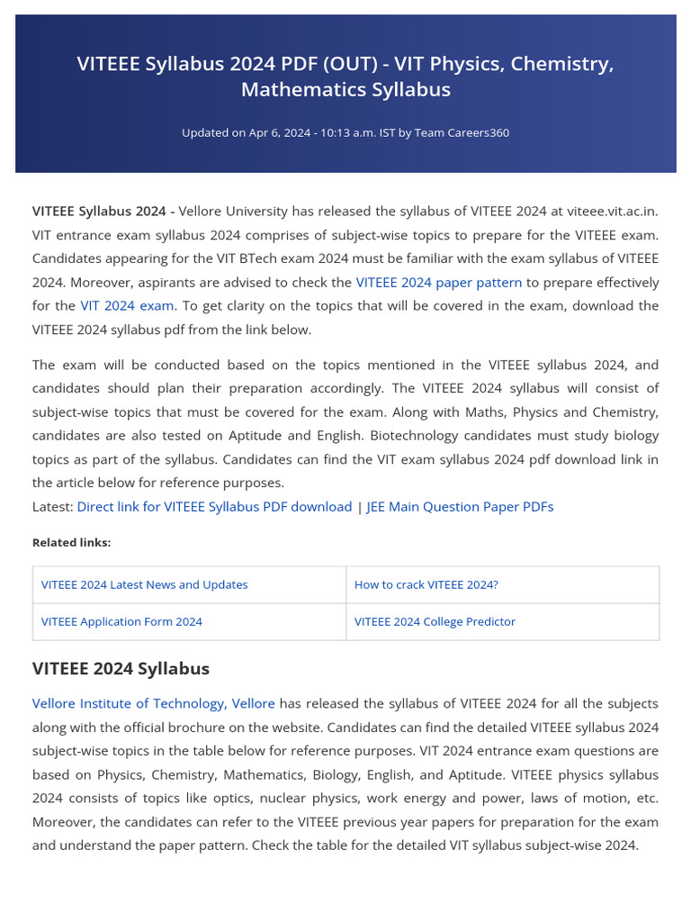 VITEEE 2024 syllabus official website is, [Link].