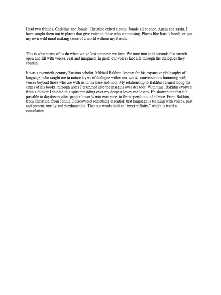 voices beyond those who are with us in the here-and-now. My relationship to Bakhtin formed along the
