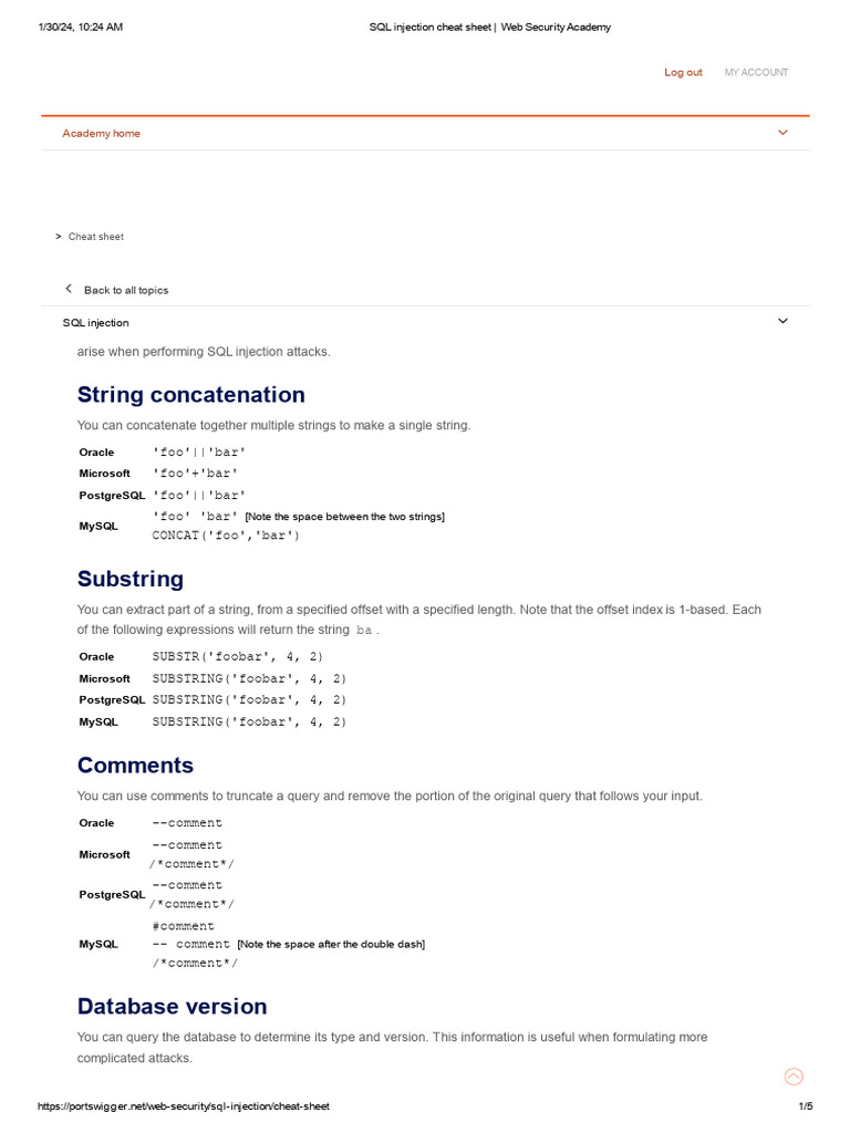1/30/24, 10:24 AM SQL injection cheat sheet | Web Security Academy