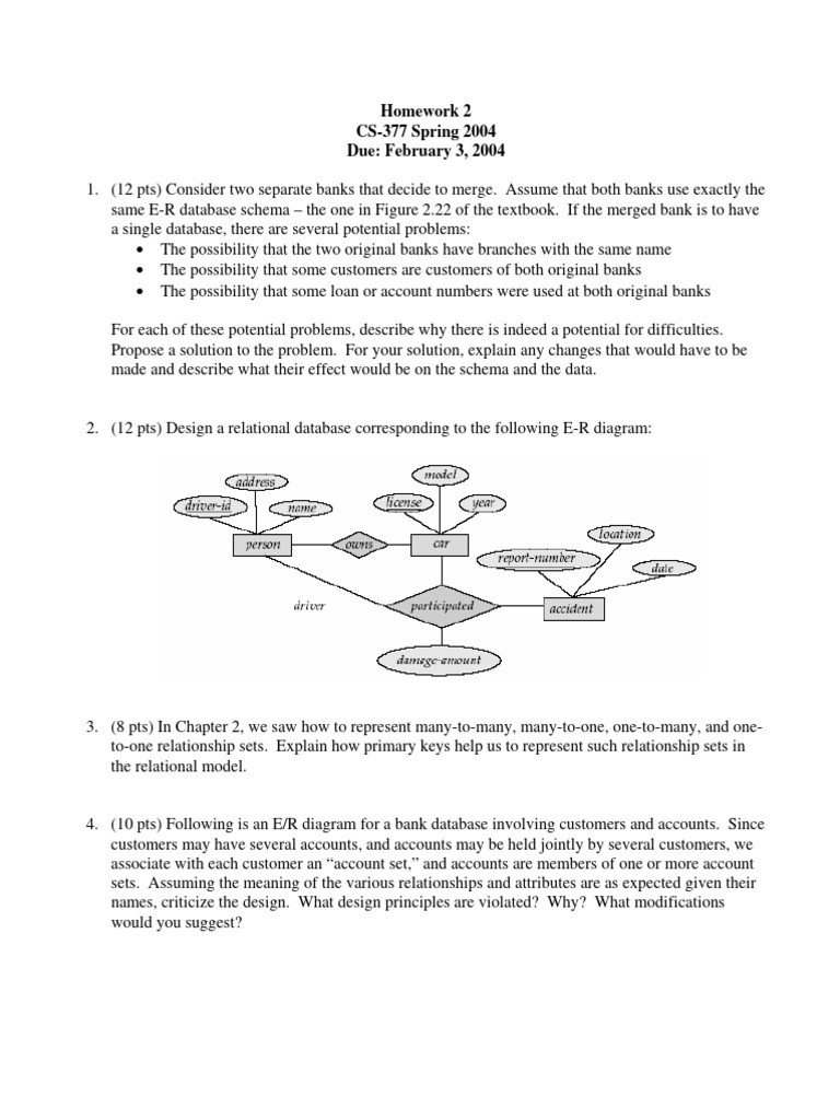 same E-R database schema – the one in Figure 2.22 of the textbook. If the merged bank is to have