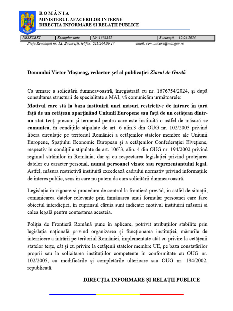 NESECRET Exemplar unic Nr. 1676832 București, 19.04.2024