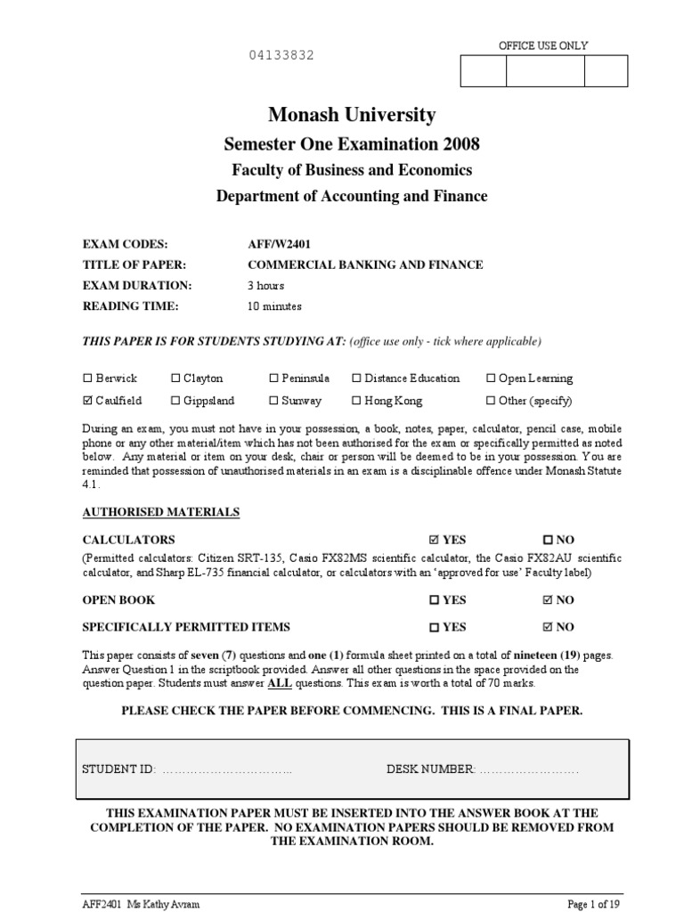 EXAM CODES: TITLE OF PAPER: EXAM DURATION: READING TIME: AFF/W2401 COMMERCIAL BANKING AND FINANCE 3 hours 10 minutes