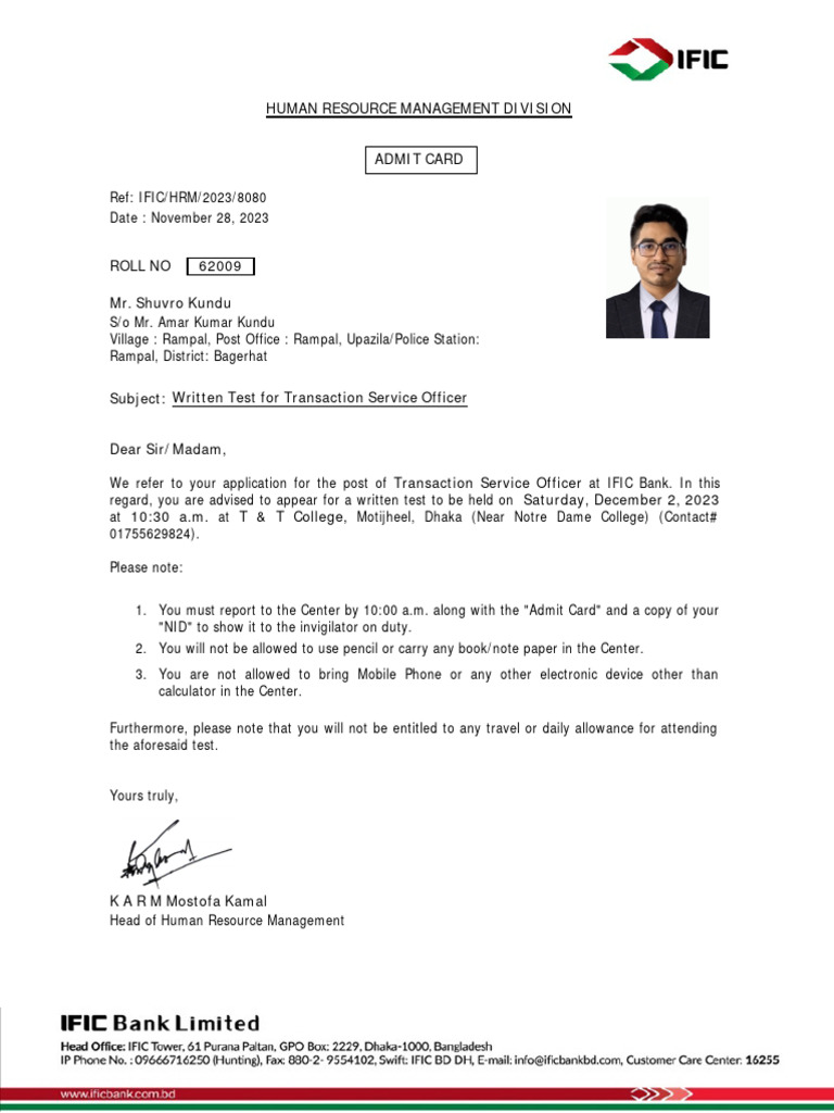 We refer to your application for the post of Transaction Service Officer at IFIC Bank. In this