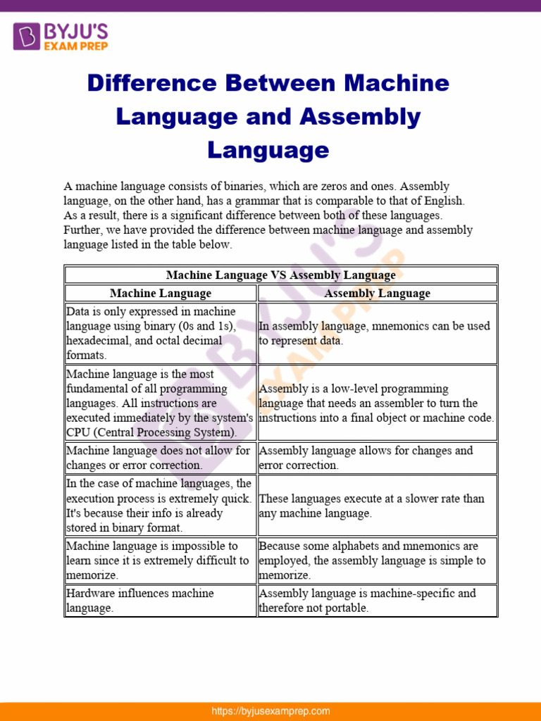 A machine language consists of binaries, which are zeros and ones. Assembly