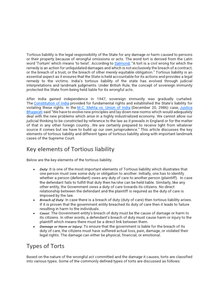 elements of tortious liability and different types of tortious liability along with important landmark