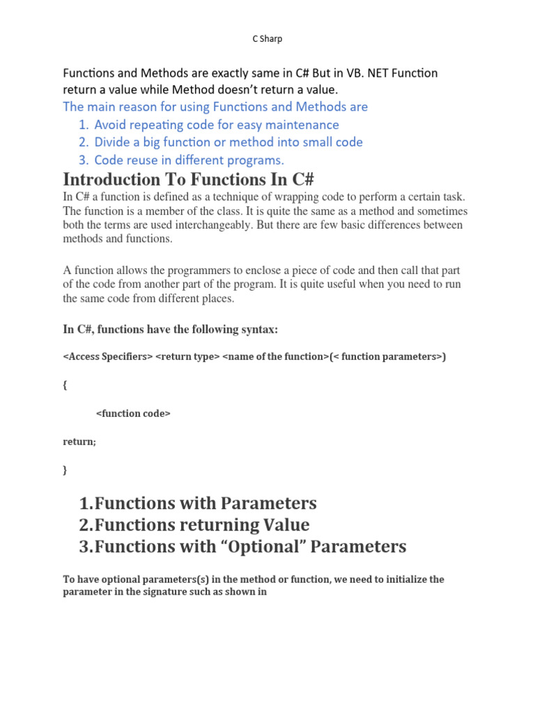 In C# a function is defined as a technique of wrapping code to perform a certain task.
