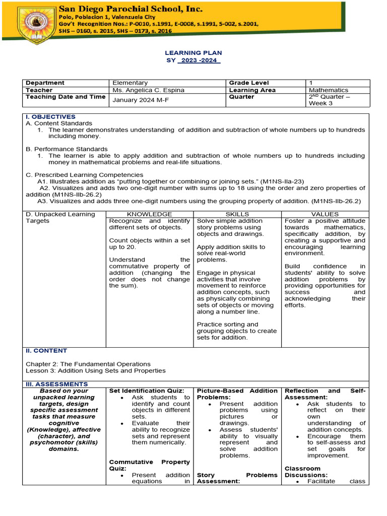 Teacher Ms. Angelica C. Espina Learning Area Mathematics