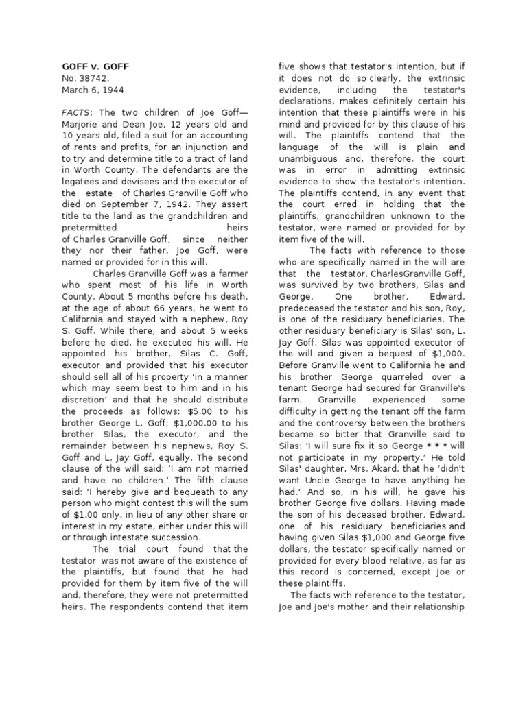 March 6, 1944 FACTS: The two children of Joe Goff Marjorie and Dean Joe, 12 years old and 10 years old, filed a suit for an accounting of rents and profits, for an injunction and to try and determine title to a tract of land in Worth County. The defendants are the legatees and devisees and the executor of the estate of Charles Granville Goff who died on September 7, 1942. They assert title to the land as the grandchildren and pretermitted heirs of Charles Granville Goff, since neither they nor their father, Joe Goff, were named or provided for in this will. Charles Granville Goff was a farmer who spent most of his life in Worth County. About 5 months before his death, at the age of about 66 years, he went to California and stayed with a nephew, Roy S. Goff. While there, and about 5 weeks before he died, he executed his will. He appointed his brother, Silas C. Goff, executor and provided that his executor should sell all of his property in a manner which may seem best to him and in his discretion and that he should distribute the proceeds as follows: $5.00 to his brother George L. Goff; $1,000.00 to his brother Silas, the executor, and the remainder between his nephews, Roy S. Goff and L. Jay Goff, equally. The second clause of the will said: I am not married and have no children. The fifth clause said: I hereby give and bequeath to any person who might contest this will the sum of $1.00 only, in lieu of any other share or interest in my estate, either under this will or through intestate succession. The trial court found that the testator was not aware of the existence of the plaintiffs, but found that he had provided for them by item five of the will and, therefore, they were not pretermitted heirs. The respondents contend that item