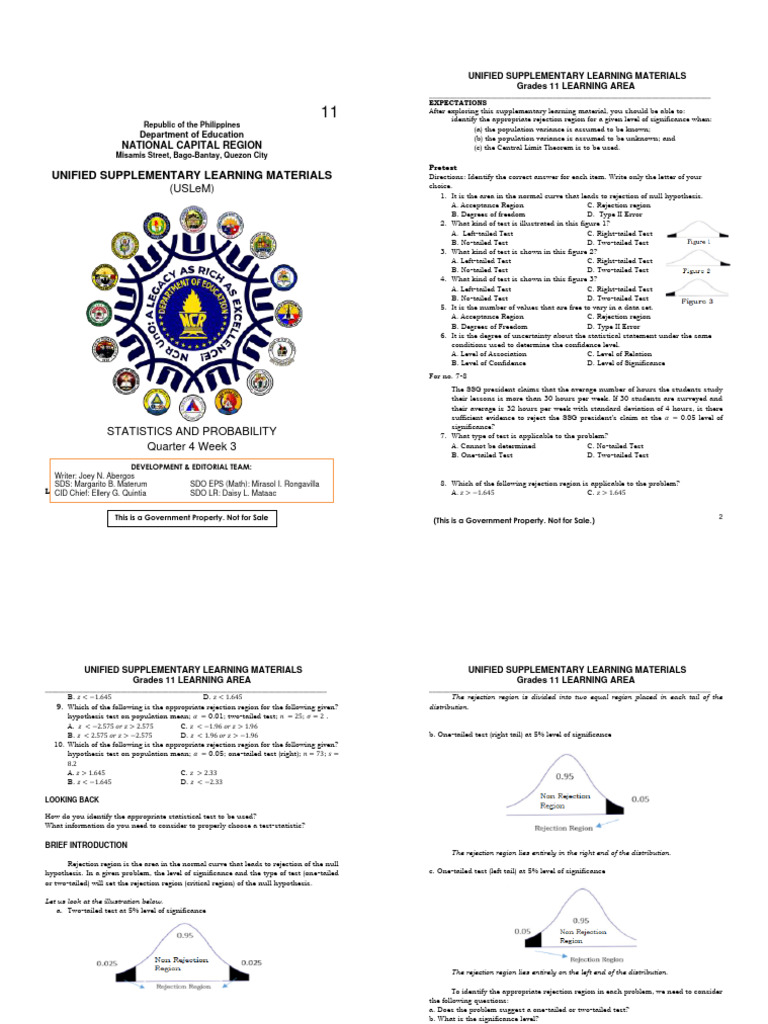 SDS: Margarito B. Materum SDO EPS (Math): Mirasol I. Rongavilla 8. Which of the following rejection region is applicable to the problem?