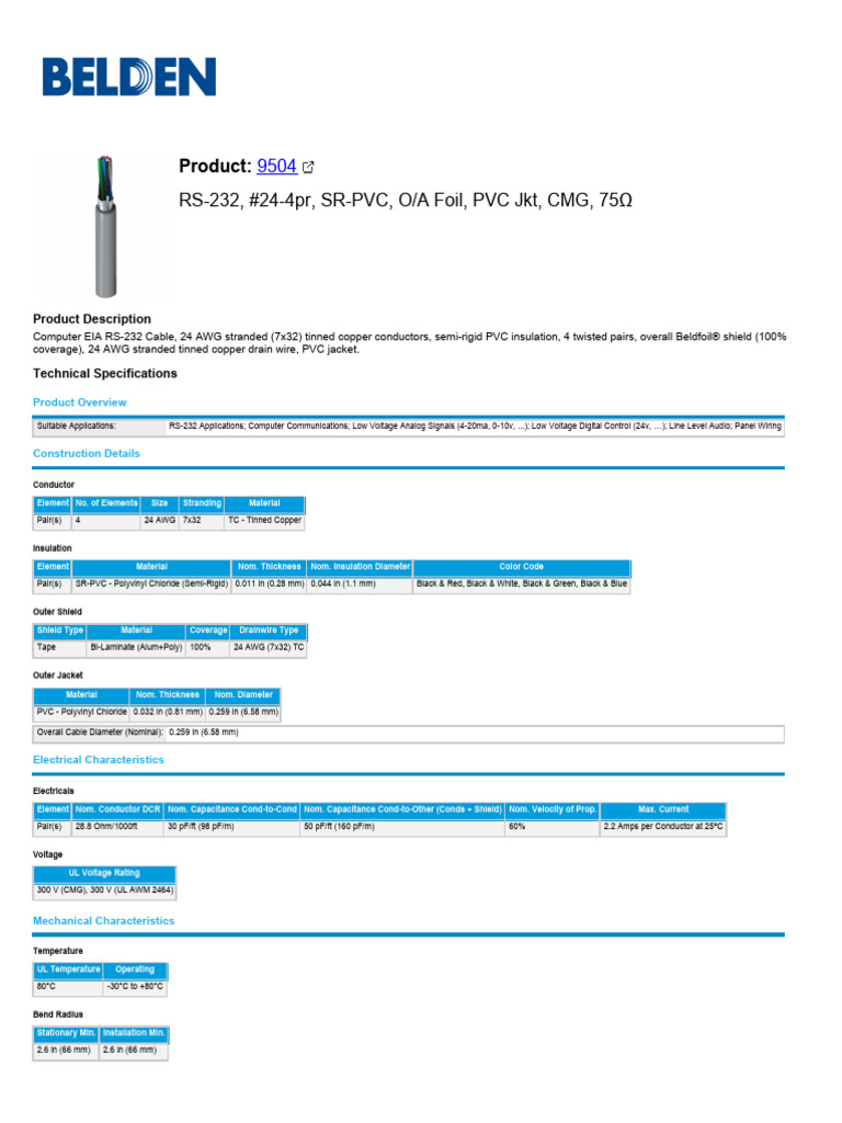 Computer EIA RS-232 Cable, 24 AWG stranded (7x32) tinned copper conductors, semi-rigid PVC insulation, 4 twisted pairs, overall Beldfoil® shield (100%