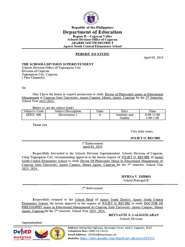 Respectfully forwarded to the Schools Division Superintendent, Schools Division of Cagayan,