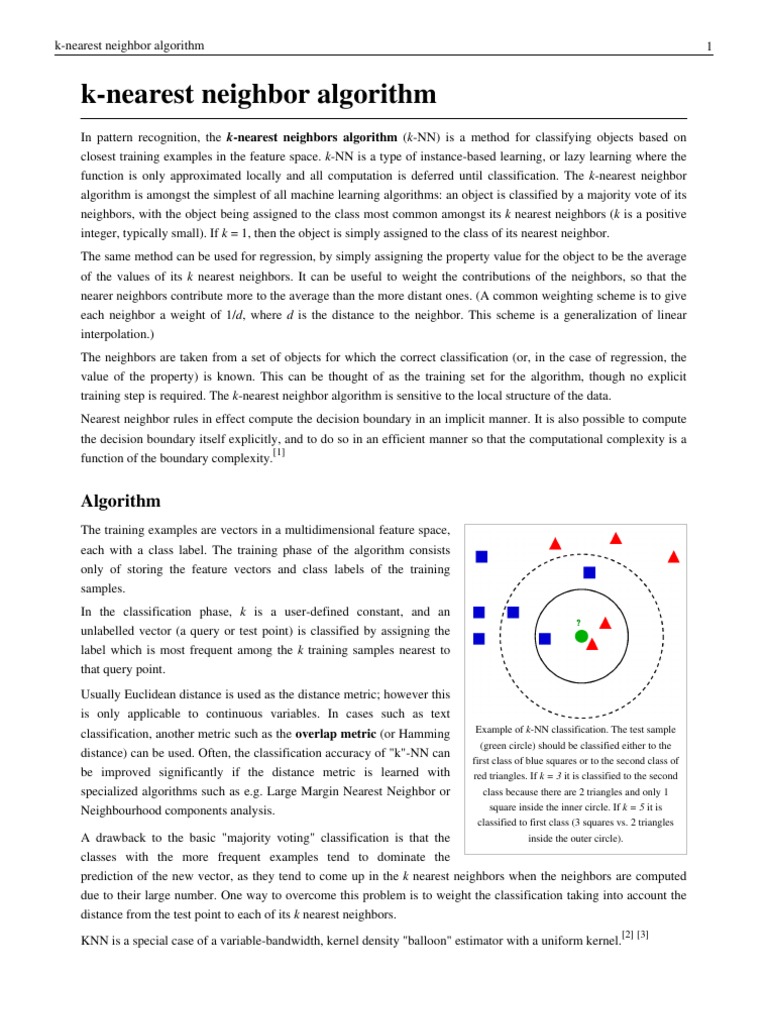 [1] Bremner D, Demaine E, Erickson J, Iacono J, Langerman S, Morin P, Toussaint G (2005). "Output-sensitive algorithms for computing nearest-neighbor decision boundaries". Discrete and Computational Geometry 33 (4): 593604. doi:10.1007/s00454-004-1152-0. [2] D. G. Terrell; D. W. Scott (1992). "Variable kernel density estimation". Annals of Statistics 20: 12361265. doi:10.1214/aos/1176348768. [3] Mills, Peter. "Efficient statistical classification of satellite measurements". International Journal of Remote Sensing. [4] Nigsch, F.; A. Bender, B. van Buuren, J. Tissen, E. Nigsch & J.B.O. Mitchell (2006). "Melting Point Prediction Employing k-nearest Neighbor Algorithms and Genetic Parameter Optimization". Journal of Chemical Information and Modeling 46 (6): 24122422. doi:10.1021/ci060149f. PMID17125183. [5] P. Hall; B. U. Park; R. J. Samworth (2008). "Choice of neighbor order in nearest-neighbor classification". Annals of Statistics 36: 21352152. doi:10.1214/07-AOS537. [6] Cover TM, Hart PE (1967). "Nearest neighbor pattern classification". IEEE Transactions on Information Theory 13 (1): 2127. doi:10.1109/TIT.1967.1053964. [7] Toussaint GT (April 2005). "Geometric proximity graphs for improving nearest neighbor methods in instance-based learning and data mining". International Journal of Computational Geometry and Applications 15 (2): 101150. doi:10.1142/S0218195905001622. [8] Franco-Lopez et al., 2001