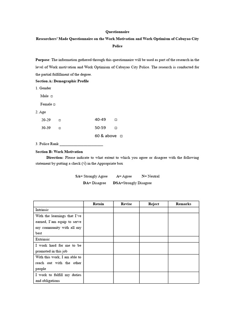 Researchers’ Made Questionnaire on the Work Motivation and Work Optimism of Cabuyao City