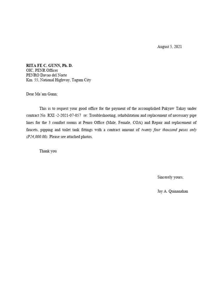 This is to request your good office for the payment of the accomplished Pakyaw Takay Contract
