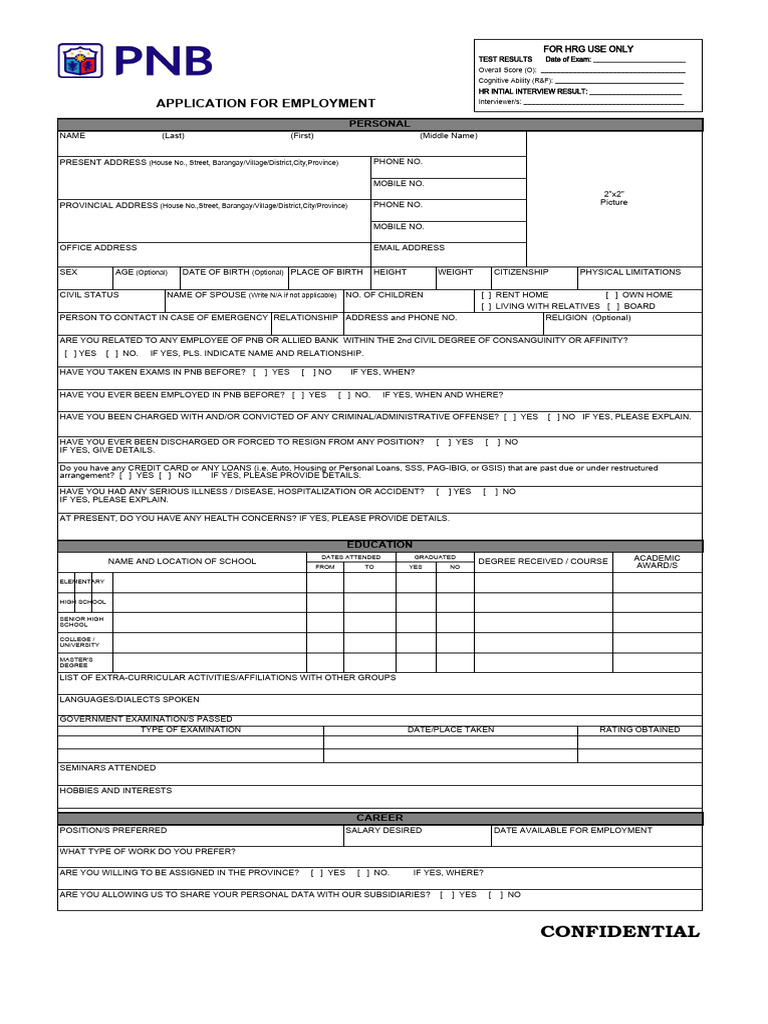 HAVE YOU EVER BEEN EMPLOYED IN PNB BEFORE? [ ] YES [ ] NO. IF YES, WHEN AND WHERE?
