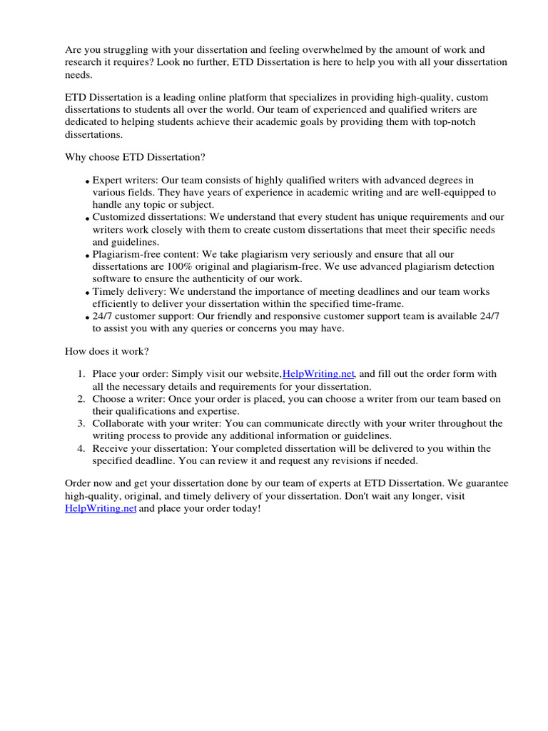 ETD Dissertation is a leading online platform that specializes in providing high-quality, custom