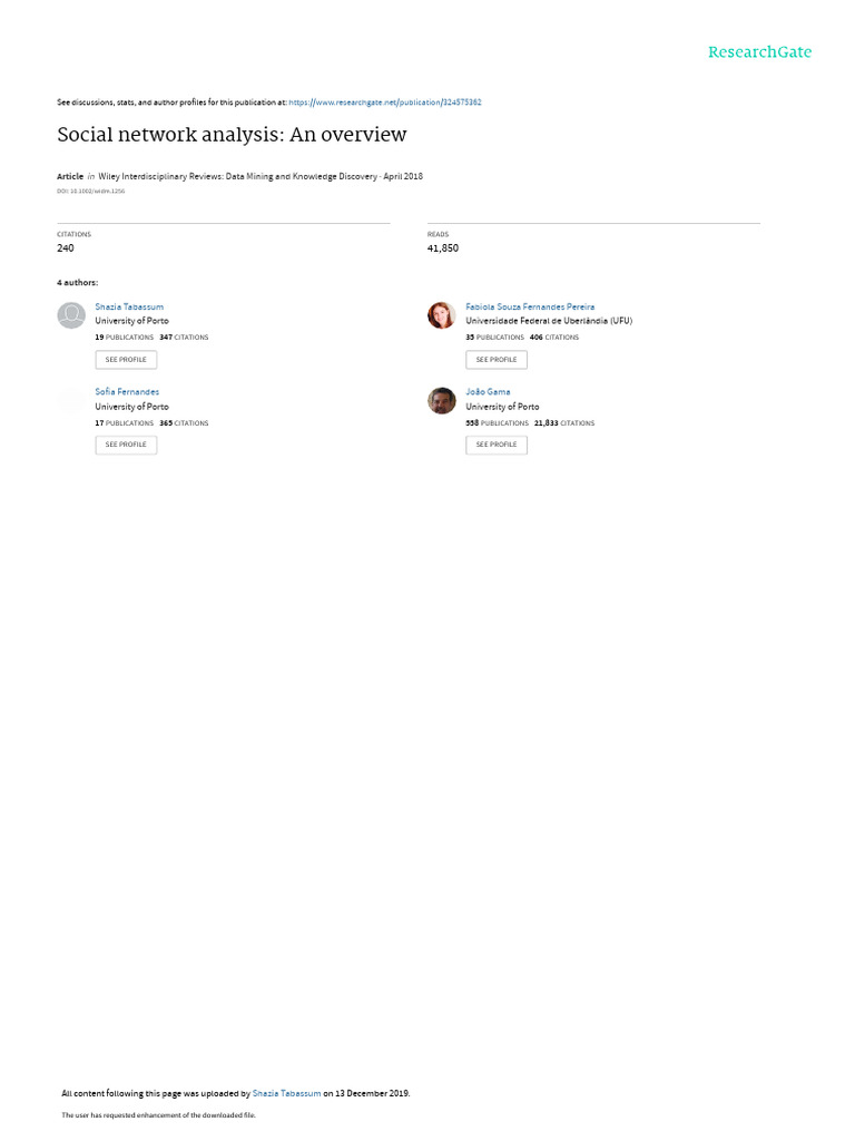 Oliveira, M. and Gama, J. (2012) An overview of social network analysis. Wiley Interdisciplinary Reviews: Data Mining and Knowl-