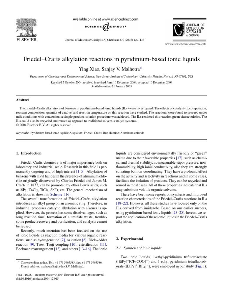 Keywords: Pyridinium-based ionic liquids; Alkylation; Friedel–Crafts; Iron chloride; Aluminum chloride