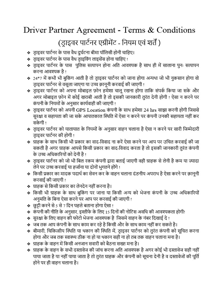 (ड्राइवर पार्टनर एग्रीमेंट - नियम एवं शर्तें )