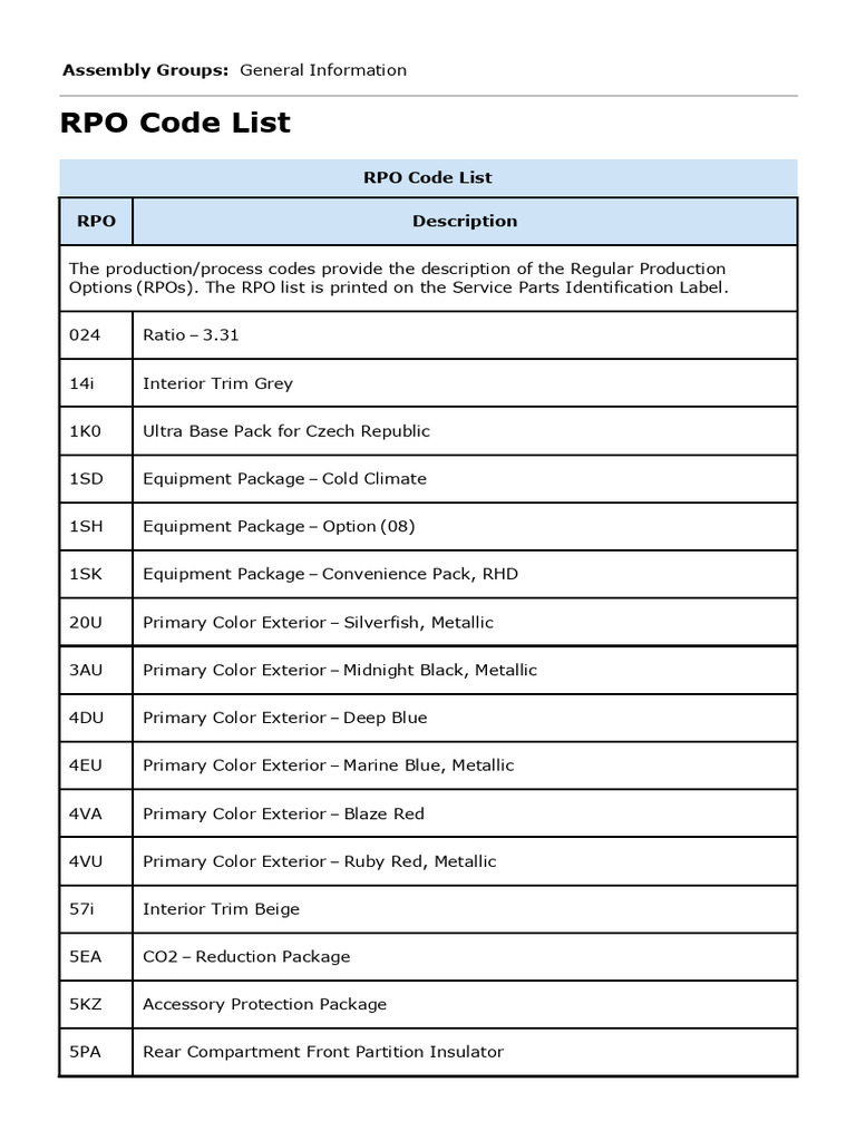 RPO Code List
