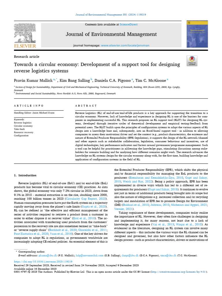 jclepro.2019.06.319. Mallick, P.K., Salling, K.B., Pigosso, D.C.A., McAloone, T.C., 2023. Closing the loop: