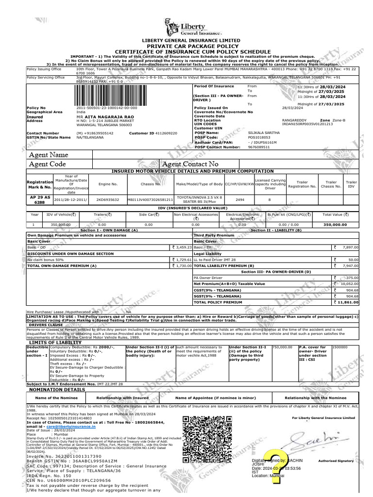 Receipt No: 10250050123101414803 For Liberty General Insurance Limited