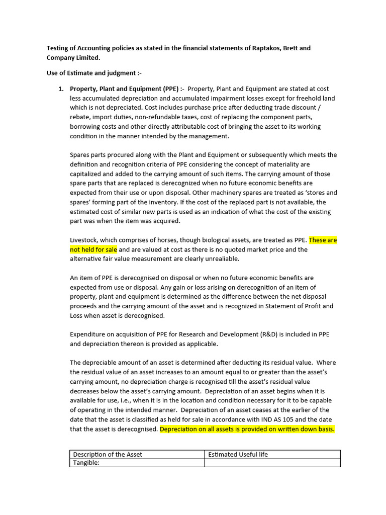 Testing of Accounting policies as stated in the financial statements of Raptakos, Brett and