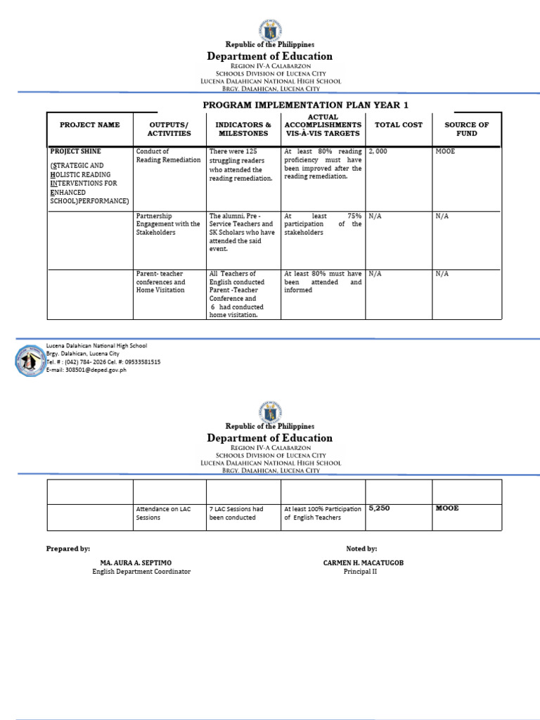 PROJECT SHINE Conduct of There were 125 At least 80% reading 2, 000 MOOE