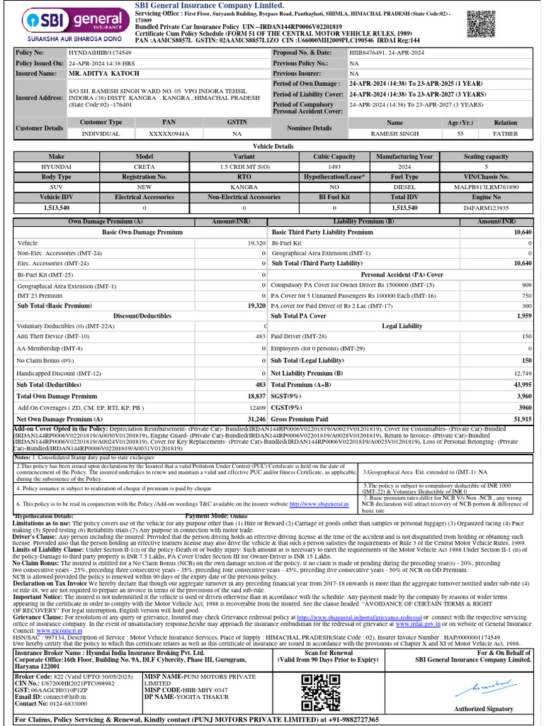 Policy No: HYNDAIHIIB/1174549 Proposal No. & Date: HIIB8476491, 24-APR-2024
