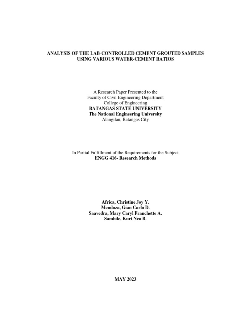 Analysis of the Lab-controlled Cement Grouted Samples using Various Water-cement