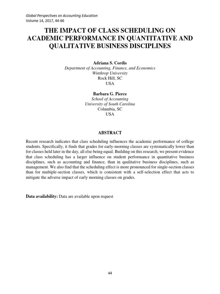 morning classes on student performance is more pronounced for quantitative disciplines than for