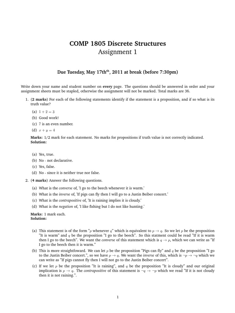 Write down your name and student number on every page. The questions should be answered in order and your assignment sheets must be stapled, otherwise the assignment will not be marked. Total marks are 36. 1. (2 marks) For each of the following statements identify if the statement is a proposition, and if so what is its truth value? (a) 1 + 2 = 3 (b) Good work! (c) 7 is an even number. (d) x + y = 4 Marks: 1/2 mark for each statement. No marks for propositions if truth value is not correctly indicated. Solution: (a) Yes, true. (b) No - not declarative. (c) Yes, false. (d) No - since it is neither true nor false. 2. (4 marks) Answer the following questions. (a) What is the converse of, I go to the beech whenever it is warm. (b) What is the inverse of, If pigs can y then I will go to a Justin Beiber concert. (c) What is the contrapositive of, It is raining implies it is cloudy. (d) What is the negation of, I like shing but I do not like hunting. Marks: 1 mark each. Solution: (a) This statement is of the form p whenever q which is equivalent to p q. So we let p be the proposition It is warm and q be the proposition I go to the beech. So this statment could be read If it is warm then I go to the beech. We want the converse of this statement which is q p, which we can write as If I go to the beech then it is warm. (b) This is more straightfoward. We can let p be the proposition Pigs can y and q be the proposition I go to the Justin Beiber concert., so we have p q. We want the inverse of this, which is p q which we can write as If pigs cannot y then I will not go to the Justin Beiber concert. (c) If we let p be the proposition It is raining, and q be the proposition It is cloudy and our original implication is p q. The contrapositive of this statement is q p which we read If it is not cloudy then it is not raining..