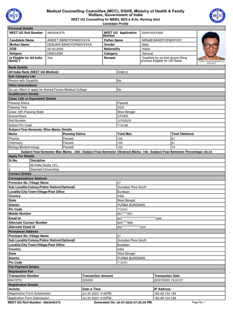NEET UG Roll Number 4603040375 NEET UG Application 230410031929