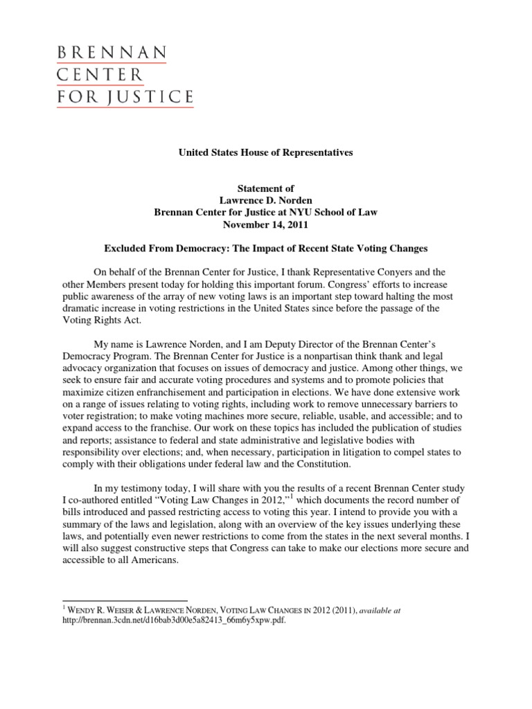 Statement of Lawrence D. Norden Brennan Center for Justice at NYU School of Law November 14, 2011 Excluded From Democracy: The Impact of Recent State Voting Changes On behalf of the Brennan Center for Justice, I thank Representative Conyers and the other Members present today for holding this important forum. Congress efforts to increase public awareness of the array of new voting laws is an important step toward halting the most dramatic increase in voting restrictions in the United States since before the passage of the Voting Rights Act. My name is Lawrence Norden, and I am Deputy Director of the Brennan Centers Democracy Program. The Brennan Center for Justice is a nonpartisan think thank and legal advocacy organization that focuses on issues of democracy and justice. Among other things, we seek to ensure fair and accurate voting procedures and systems and to promote policies that maximize citizen enfranchisement and participation in elections. We have done extensive work on a range of issues relating to voting rights, including work to remove unnecessary barriers to voter registration; to make voting machines more secure, reliable, usable, and accessible; and to expand access to the franchise. Our work on these topics has included the publication of studies and reports; assistance to federal and state administrative and legislative bodies with responsibility over elections; and, when necessary, participation in litigation to compel states to comply with their obligations under federal law and the Constitution. In my testimony today, I will share with you the results of a recent Brennan Center study I co-authored entitled Voting Law Changes in 2012, 1 which documents the record number of bills introduced and passed restricting access to voting this year. I intend to provide you with a summary of the laws and legislation, along with an overview of the key issues underlying these laws, and potentially even newer restrictions to come from the states in the next several months. I will also suggest constructive steps that Congress can take to make our elections more secure and accessible to all Americans.