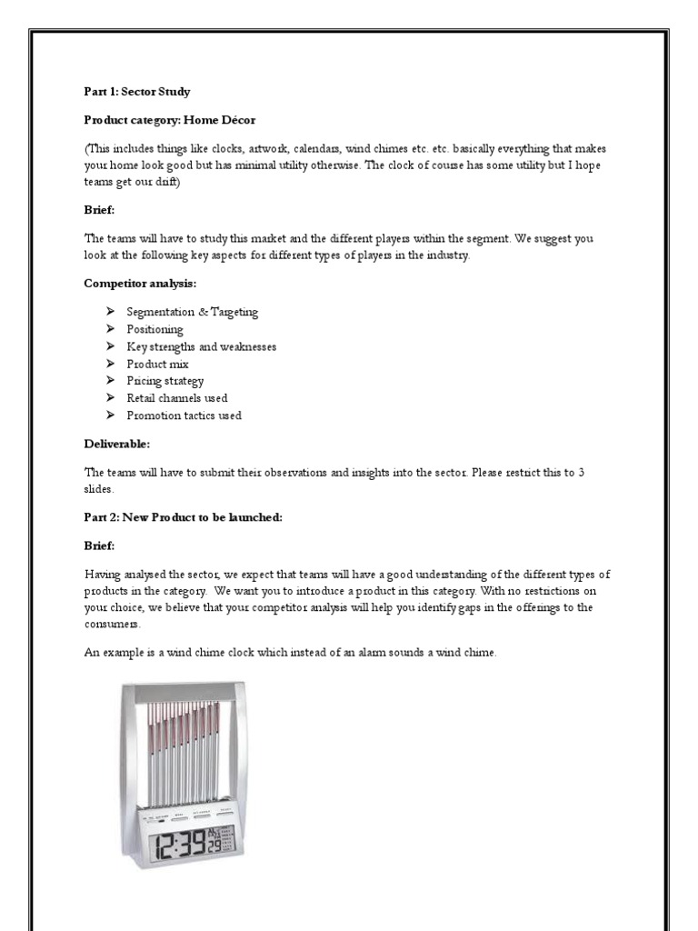 Deliverable: The teams will have to submit their observations and insights into the sector. Please restrict this to 3 slides. Part 2: New Product to be launched: Brief: Having analysed the sector, we expect that teams will have a good understanding of the different types of products in the category. We want you to introduce a product in this category. With no restrictions on your choice, we believe that your competitor analysis will help you identify gaps in the offerings to the consumers. An example is a wind chime clock which instead of an alarm sounds a wind chime.