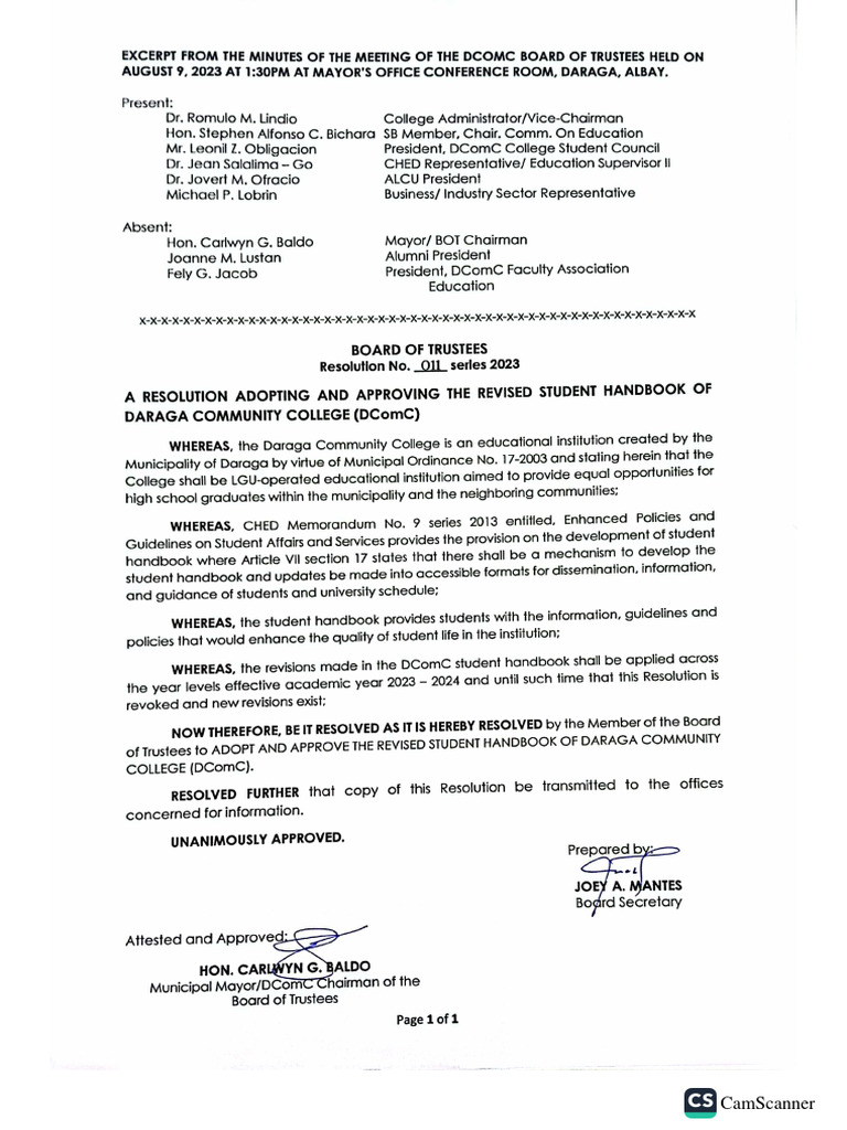 Revised Student Handbook With Bot and SB Reso