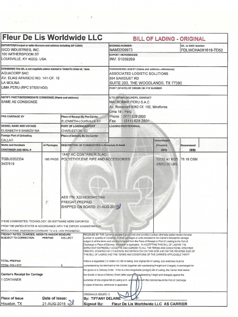 Houston, Tx 21-AUG-2018 signed Gy: Fleur De Lis Worldwide LLC AS CARRIERFleur De Lis Worldwide LLC BILL OF LADING - ORIGINAL