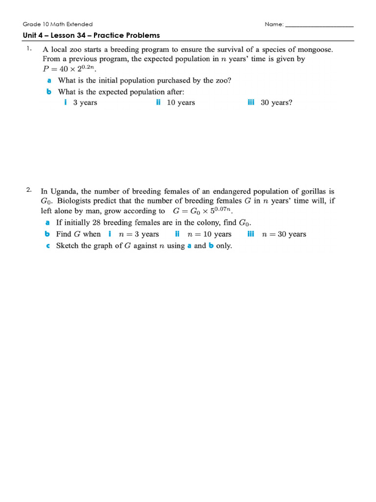 The document contains 5 math practice problems for a Grade 10 math extended unit 4 lesson 34. The problems are unlabeled and contain no other context or information.