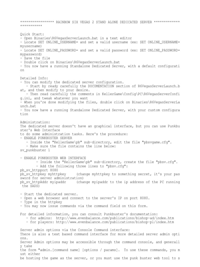 bat in a text editor - Locate SET ONLINE_USERNAME= and set a valid username (ex: SET ONLINE_USERNAME= myusername) - Locate SET ONLINE_PASSWORD= and set a valid password (ex: SET ONLINE_PASSWORD= mypassword) - Save the file - Double click on Binaries\R6VegasServerLaunch.bat - You now have a running Standalone Dedicated Server, with a default configurati on Detailed Info: - You can modify the dedicated server configuration. - Start by ready carefully the DOCUMENTATION section of R6VegasServerLaunch.b at, and then modify to your desire. - Then read carefully the comments in KellerGame\Config\PC\R6VegasServerConfi g.ini, and tweak whatever you want - When you're done modifying the files, double click on Binaries\R6VegasServerLa unch.bat - You now have a running Standalone Dedicated Server, with your custom configura tion Administration: The dedicated server doesn't have an graphical interface, but you can use Punkbu ster's Web Interface to do some administration tasks. Here's the procedure: - ENABLE PUNKBUSTER SERVER - Inside the "KellerGame\pb" sub-directory, edit the file "pbsvgame.cfg". - Make sure the file contains the line below: sv_punkbuster 1 - ENABLE PUNKBUSTER WEB INTERFACE - Inside the "KellerGame\pb" sub-directory, create the file "pbsv.cfg". - Add the following three lines to "pbsv.cfg": pb_sv_httpport 8080 pb_sv_httpkey myhttpkey (change myhttpkey to something secret, it's your pas sword for server administration) pb_sv_httpAddr myipaddr (change myipaddr to the ip address of the PC running the SADS) Start the dedicated server. Open a web browser and connect to the server's IP on port 8080. Type in the httpkey You may now issue commands via the command field on this form.