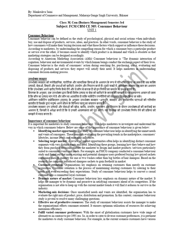 Subject: FCM CBM CE 305: Consumer Behaviour