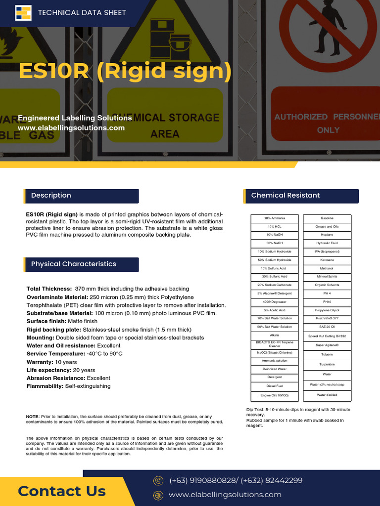 ES10R (Rigid sign) is made of printed graphics between layers of chemical- 10% Ammonia Gasoline