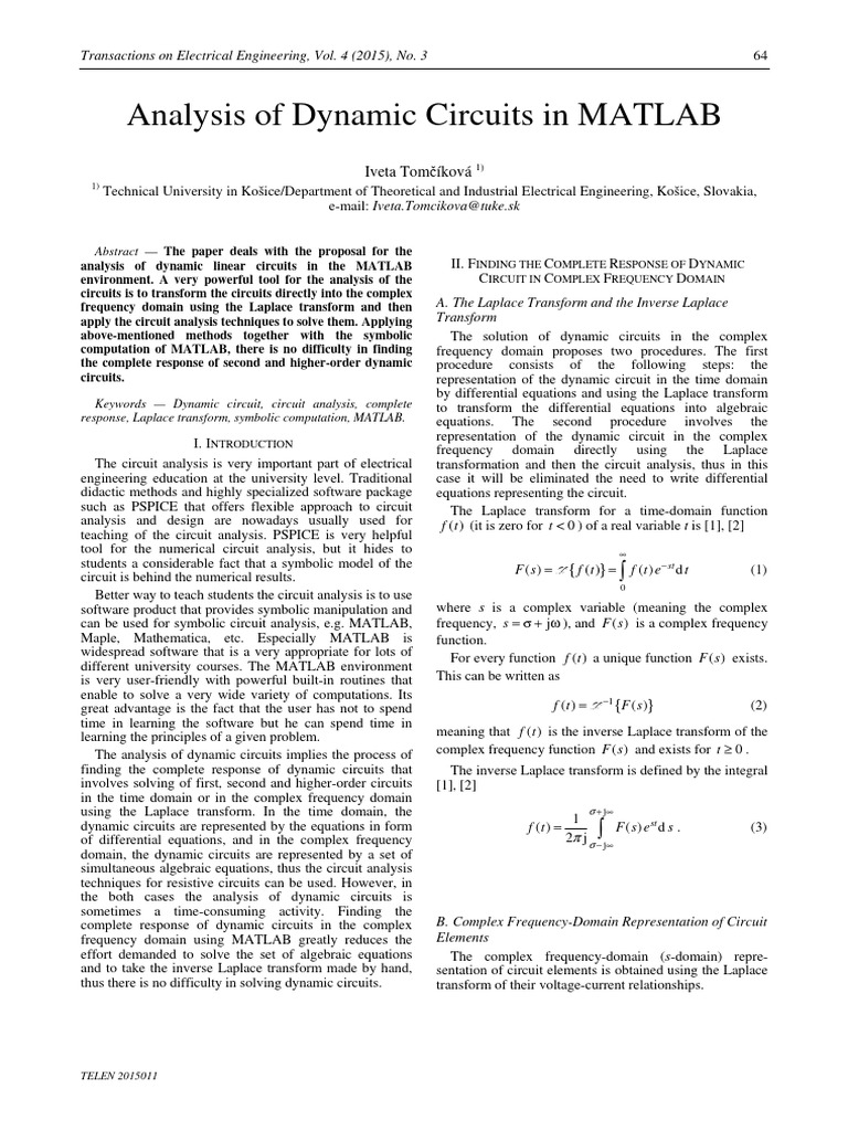 the Laplace transform in the MATLAB environment was the circuit can concentrate on gaining an insight into