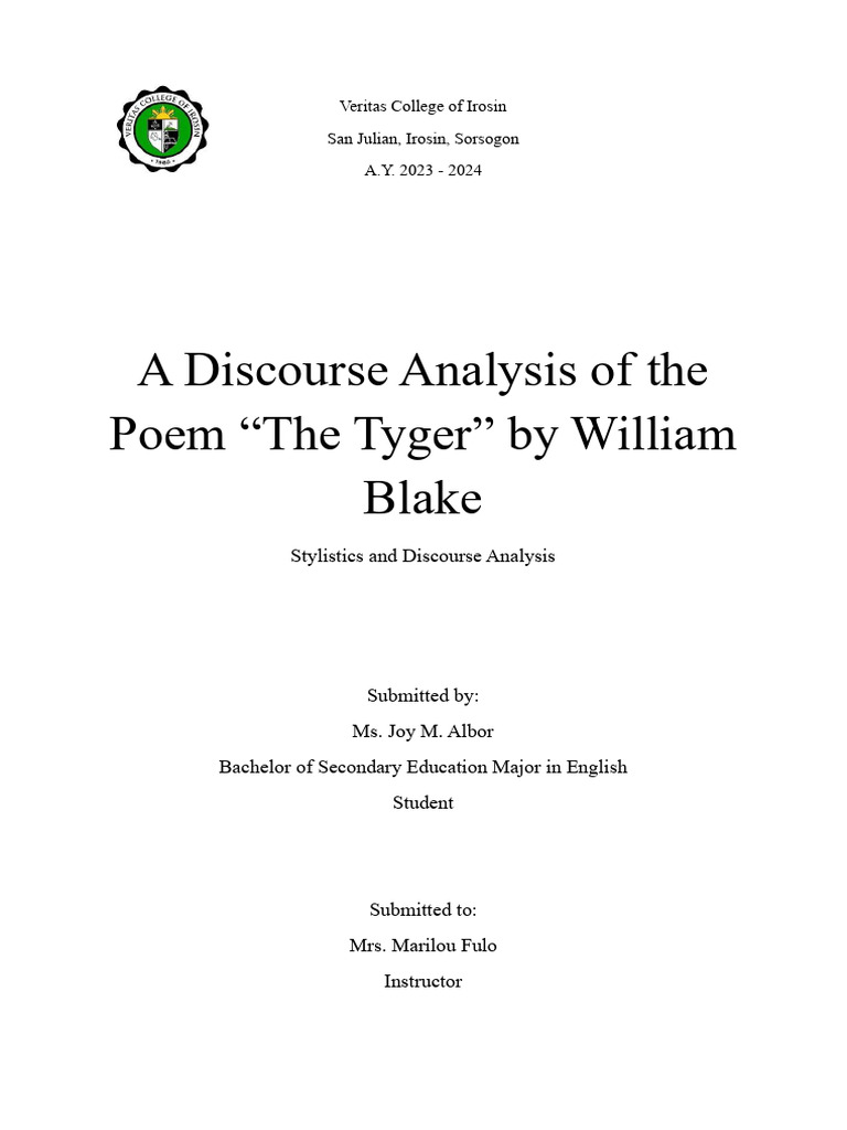This article presents an analysis of William Blake’s poem ‘The Tyger’ using a
