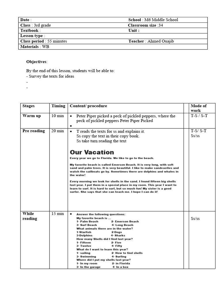 Class period : 55 minutes Teacher : Ahmed Ouajib