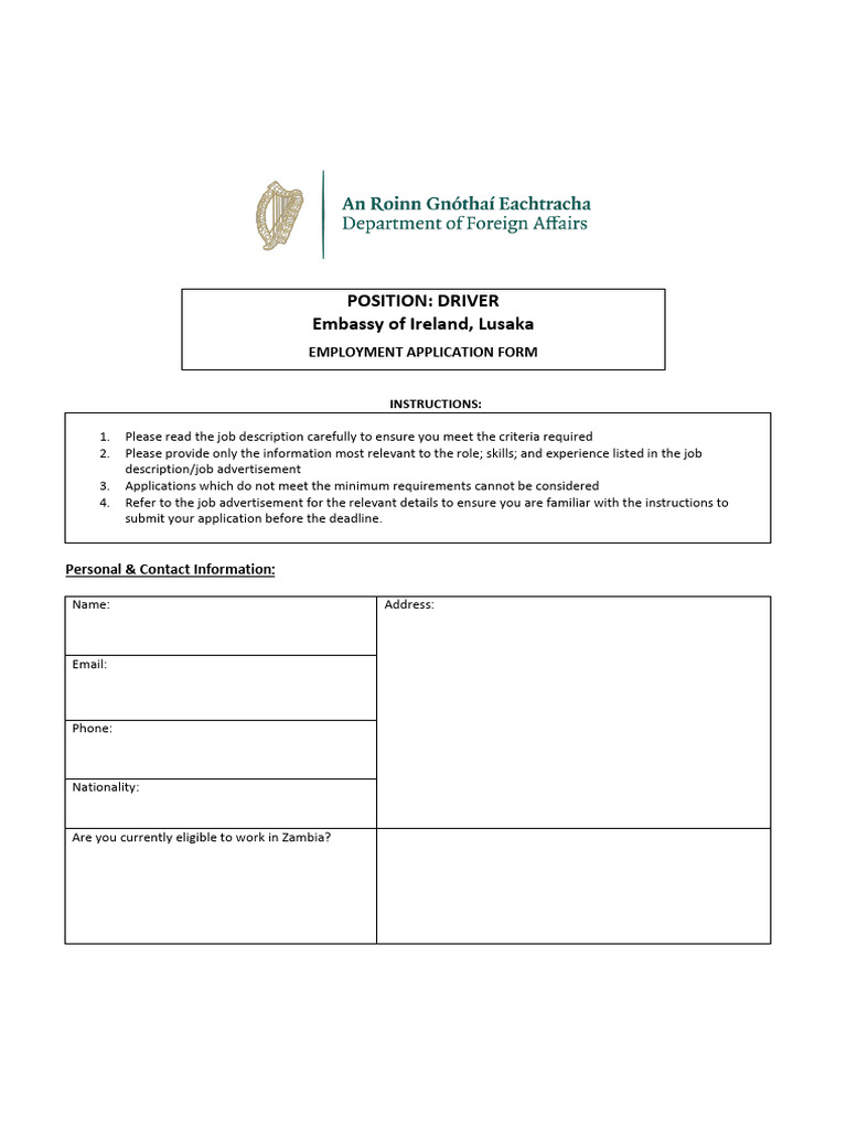 2. Send the completed application form by e-mail only to RecruitmentLusaka@dfa.ie, with the heading