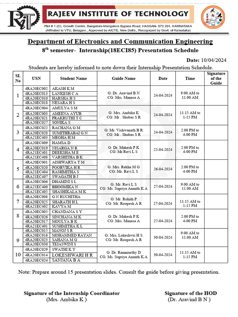 Students are hereby informed to note down their Internship Presentation Schedule.