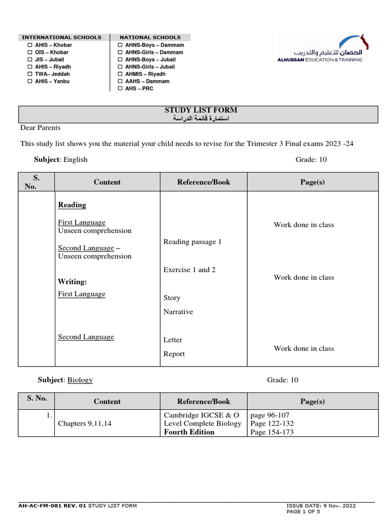 AH-AC-FM-081 REV. 01 STUDY LIST FORM ISSUE DATE: 9 Nov. 2022