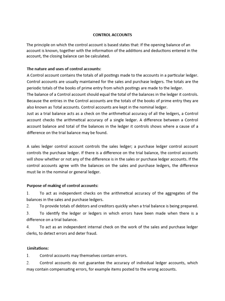 Control accounts are usually maintained for the sales and purchase ledgers. The totals are the