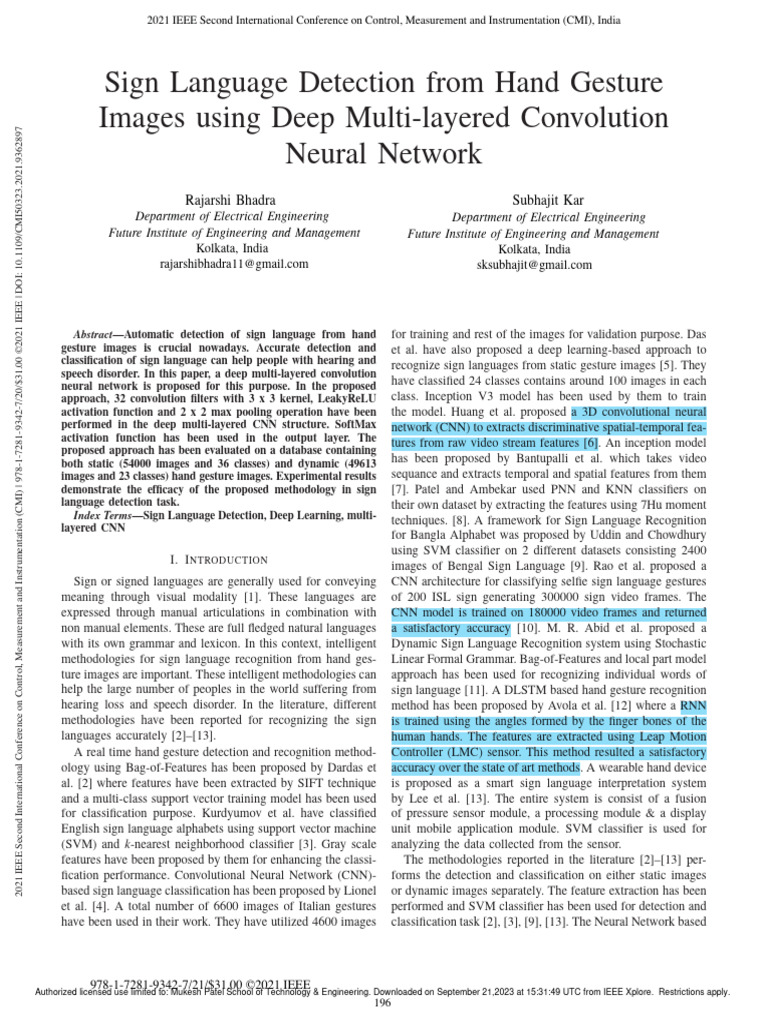 Abstract—Automatic detection of sign language from hand for training and rest of the images for validation purpose. Das